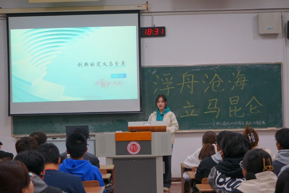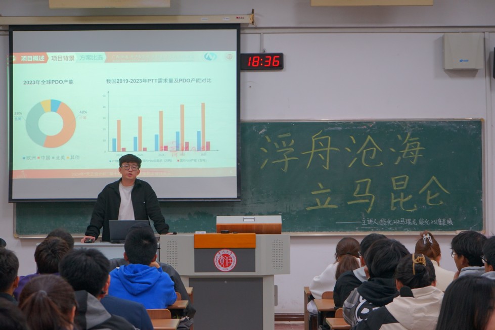 為提升同學(xué)們對科技創(chuàng)新及雙創(chuàng)競賽的認(rèn)知水平,激發(fā)他們積極參與的熱情,我院于11月5日在W1210教室開展了“石化青年說”系列講座第二講——浮舟滄海,立馬昆侖。本次活動(dòng)由能化231唐晨曦和能化212馬瑞龍主講,我院學(xué)生代表參加。