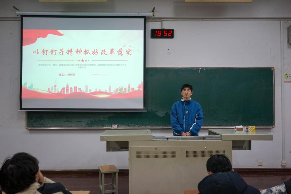為積極響應黨的二十屆三中全會的號召,以釘釘子精神全面推動各項改革舉措的落實,我院于12月10日在W1205教室開展了“青年講師團”系列講座第五講——以釘釘子精神抓好改革落實。本次講座由學生第一黨支部化工222徐長海主講,我院學生代表參加。