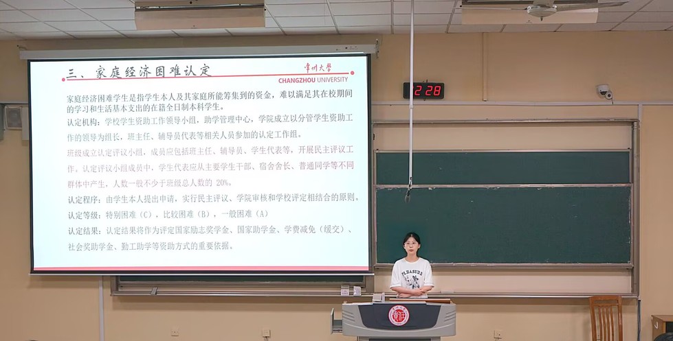 會議第二項議程,由輔導員何瑞玉為同學們進行資助政策解讀。何老師圍繞學生資助體系,詳細介紹了國家助學貸款、國家助學金、國家勵志獎學金、社會助學金以及學校各類專項資助項目的申請條件、流程和注意事項。她的講解細致全面,旨在幫助同學們清晰了解政策,徹底解除后顧之憂,決不讓經濟問題成為求學路上的絆腳石,鼓勵大家放下包袱,專心學業(yè)。